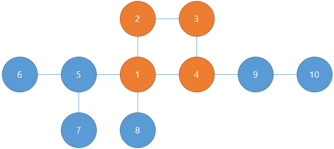 그림1: 예제 그래프 그림의 그래프는 [1, 2, 3, 4]번 정점이 사이클을 이루고 있으며, 그 외의 정점은 사이클에 있는 한 정점을 루트로 갖는 서브트리에 포함된 정점들이다.