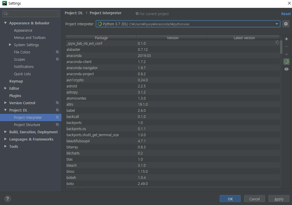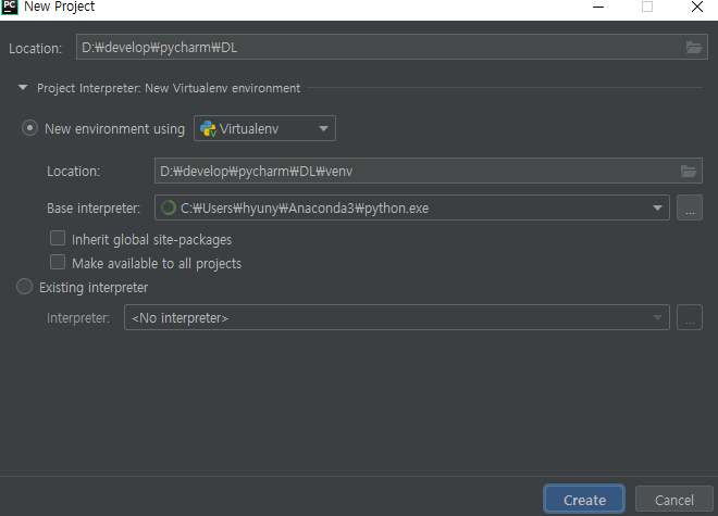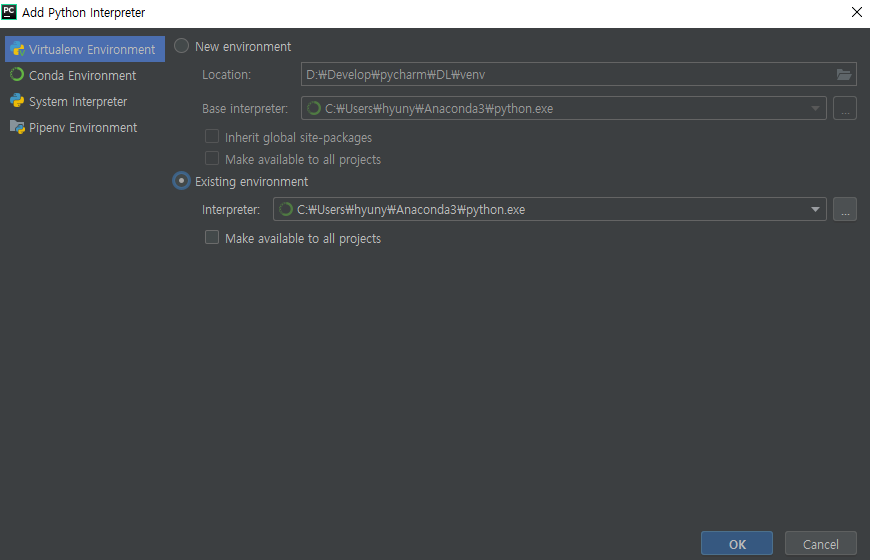Virtualenv Environment 메뉴에서 Existing environment를 누른 후, Interpreter에서 미리 설치해둔 Anaconda 폴더의 python으로 설정해준다.