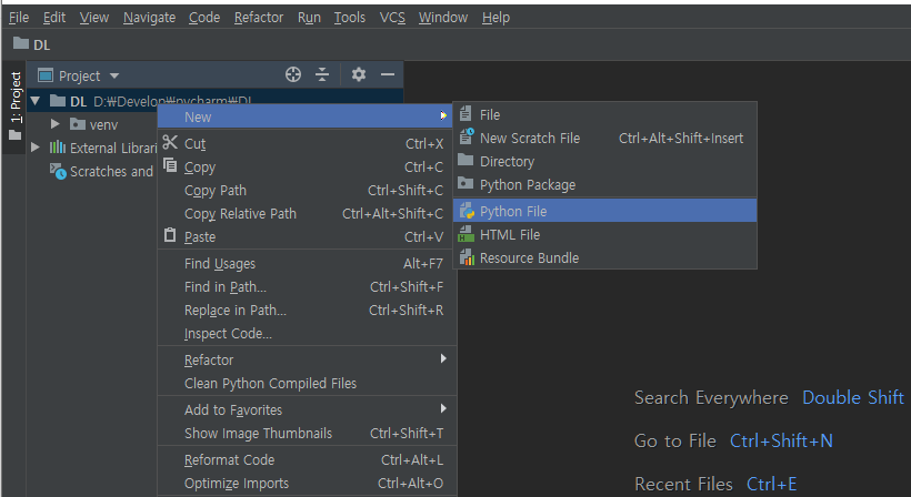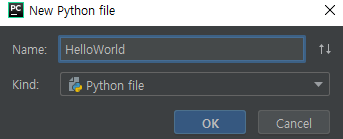 프로젝트명을 우클릭하여 New, Python File버튼을 차례로 눌러준다.