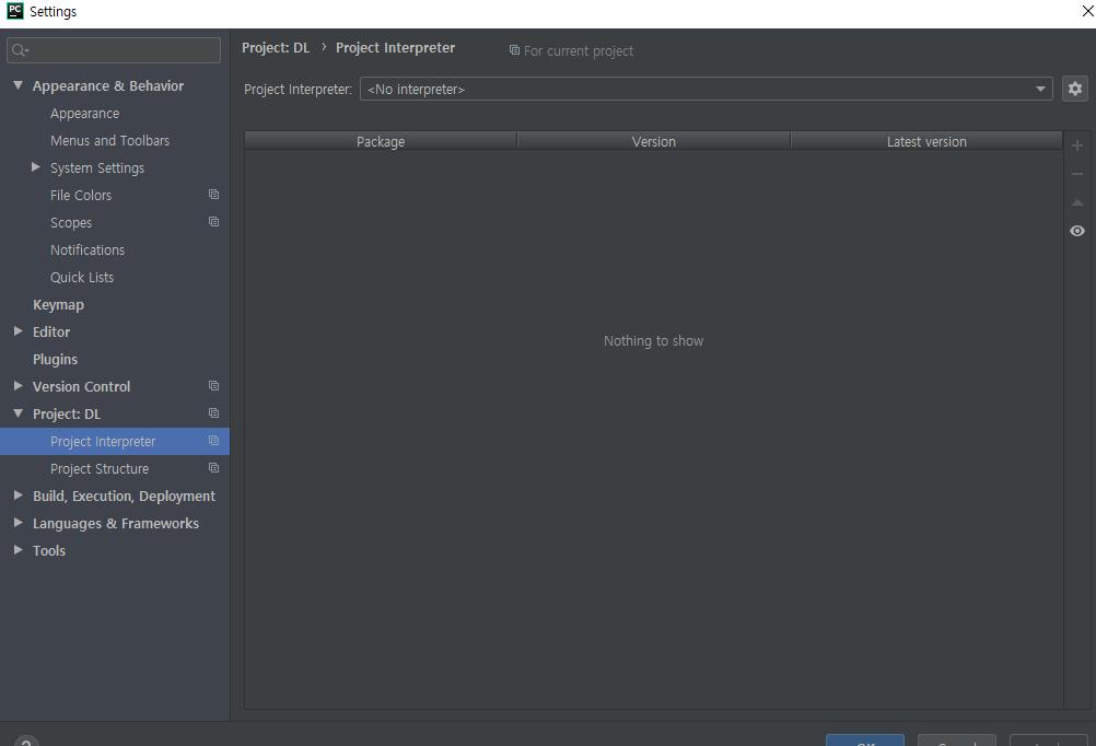 Project: "프로젝트명" 탭의 Project Interpreter를 눌러보면 아무 환경도 없는 것을 볼 수 있다.
