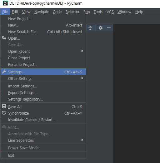 File 메뉴의 Settings(Ctrl + Alt + S)를 눌러 다시 설정을 시도해보자.