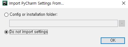 Pycharm을 처음 실행하면 이런 화면을 보게 된다. 가볍게 OK를 눌러주자. OK 버튼을 누르면 스킨과 더불어 다양한 설정을 할 수 있는데, 스킨만 설정하고 skip버튼을 눌러 넘어갔다.