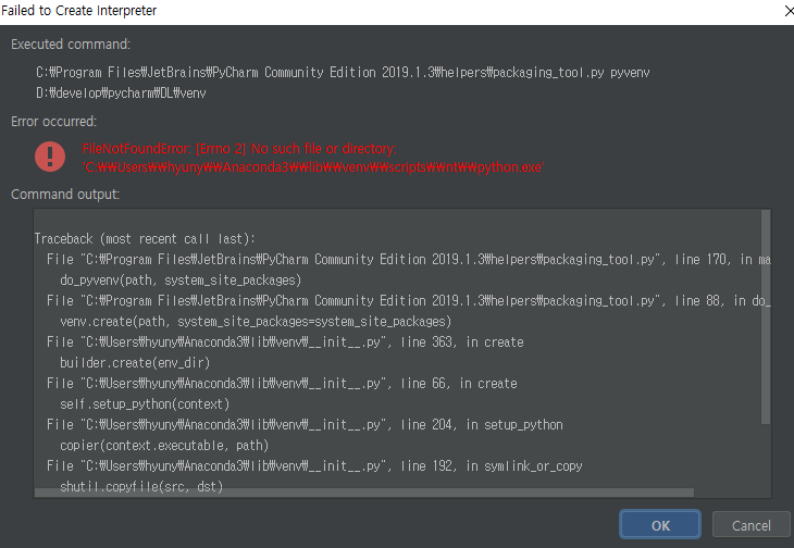 이게 왠걸... 하지만 프로젝트 생성을 눌러보니 "Failed to Create Interpreter"라는 제목의 에러 메세지가 출력되었다.