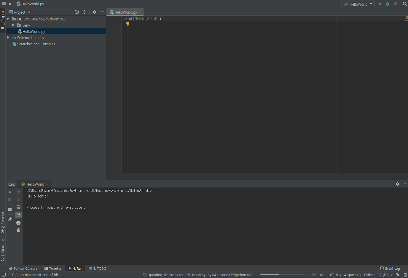 OK 버튼을 누르면 이렇게 Python 3.7로 interpreter를 잡은 것을 볼 수 있다.